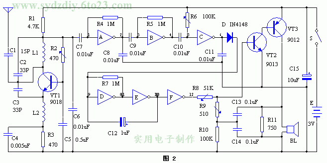 當(dāng)接收到發(fā)射機(jī)信號(hào)時(shí),門電路C輸出為正,二極管VD導(dǎo)通,門D、E組成的低頻振蕩器停振,門F輸出為低電平,VT2、VT3互補(bǔ)振蕩器停振,揚(yáng)聲器BL不發(fā)聲。