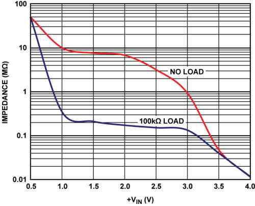 圖6:具有反極性保護二極管時,off-amp的輸入阻抗。