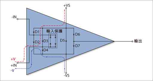 當(dāng)放大器的電源供應(yīng)被關(guān)閉時,處于±IN上的電壓就可以啟動從D1至D4的二極管。圖1展示了從+IN通過保護二極管,一直到供應(yīng)極的電流路徑,假設(shè)接地的回返路徑存在時。紅色的走線所代表的是正電壓通往+Vs的路徑;藍色走線所代表的則是負(fù)電壓通往-Vs的路徑。當(dāng)有電壓出現(xiàn)在off-amp之輸出時,就可以描繪從輸出經(jīng)過D6與D7二極管至供應(yīng)極的類似路徑。而最重要的安全預(yù)防措施就是對進入off-amp接腳的電流加以限制。