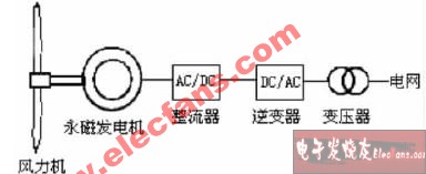 18761 永磁同步風(fēng)力發(fā)電機(jī)由于機(jī)械損耗小、運(yùn)行效率高、維護(hù)成本低等優(yōu)點(diǎn)成為繼雙饋感應(yīng)風(fēng)電機(jī)組之后的又一重要風(fēng)力發(fā)電機(jī)型受到廣泛關(guān)注,并逐漸開始投入使用。永磁同步風(fēng)力發(fā)電系統(tǒng)基本結(jié)構(gòu)如圖1所示,它主要由風(fēng)力機(jī)、永磁同步發(fā)動(dòng)機(jī)、變頻器和變壓器組成。