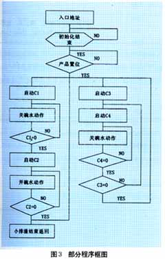 ??? 在V3.1 STEP 7—Micro/Win32軟件環(huán)境下進行編制。S7-200系列PLC豐富的功能指令和符號尋址方式極大方便了編程。在程序中應(yīng)用A/D轉(zhuǎn)換的數(shù)字濾波、功能塊、數(shù)據(jù)塊、和通訊接口等功能,充分體現(xiàn)PLC功能控制的特點,使程序簡潔、直觀。程序結(jié)構(gòu)模塊化設(shè)計,梯形圖方式編程。程序分為如下幾個部分:主程序、初始化程序、輸入程序、產(chǎn)品程序、CIP程序、模擬量處理程序、報警程序、輸出程序、供料泵控制程序、入料口控制程序和通訊程序等組成。圖3為“產(chǎn)品”處理模塊部分程序框圖。程序中V55.1為控制器面板“產(chǎn)品”按鍵,? V105.5為遠程控制器置位位?!爱a(chǎn)品”狀態(tài)時,當V101.1為1,C1、C3開始計時,SM0.4按分脈沖計時,當計滿VW0時,允許小排動作。C1重新計數(shù),V55.1為1,啟動C2,SM0.5按秒脈沖計時,為前沖洗狀態(tài),V60.2為1,關(guān)碗水電磁閥動作。當V55.2為1,V60.0為1,開碗水電磁閥動作,并持續(xù)VW4時間,同樣,當V55.4為1,置為后沖洗狀態(tài),保持關(guān)碗水動作。這樣,程序一個周期的小排渣結(jié)束,程序繼續(xù)循環(huán)執(zhí)行。