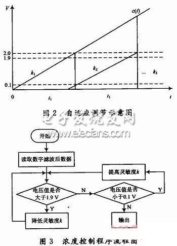 采用一般傳感器測量粉塵濃度,其測量范圍約為0~3 mg/m3。為保證高濃度和低濃度的測量準(zhǔn)確性,擴(kuò)大儀器的測量范圍,本文提出了一種通過調(diào)節(jié)傳感器接收靈敏度來實(shí)現(xiàn)自適應(yīng)調(diào)節(jié)的算法(調(diào)節(jié)原理如圖2所示),即當(dāng)被測環(huán)境的粉塵濃度較低時(shí),提高傳感器的接收靈敏度;當(dāng)被測環(huán)境的粉塵濃度較高時(shí),降低傳感器的接收靈敏度,并通過實(shí)驗(yàn)對這種方法進(jìn)行了驗(yàn)證,圖3是軟件控制流程圖。