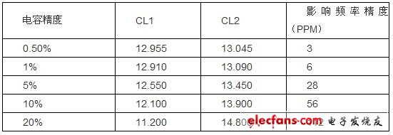 在很多應(yīng)用場合,電容精度取5%,從上表可看出它對頻率精度的影響可達(dá)到28PPM。這在設(shè)計中容易被忽略的。