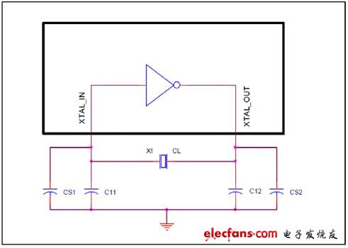 在基頻諧振中C1為10-30fF,一般取值為20fF。C0取值與晶體的尺寸有關(guān),一般取值為5pF。但是CL的計算與晶體外接電容和PCB設(shè)計和材料有關(guān)。下圖是參考電路圖