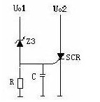 如上圖,當Uo1輸出升高,穩(wěn)壓管(Z3)擊穿導通,可控硅(SCR1)的控制端得到觸發(fā)電壓,因此可控硅導通。Uo2電壓對地短路,過流保護電路或短路保護電路就會工作,停止整個電源電路的工作。當輸出過壓現象排除,可控硅的控制端觸發(fā)電壓通過R對地泄放,可控硅恢復斷開狀態(tài)。