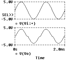 (1) Vi幅值為5V,頻率為1KHz的正弦波。作瞬態(tài)分析,觀察輸出Vo形的交越失真。進一步作直流掃描分析,求失真所對應(yīng)的輸入電壓范圍。