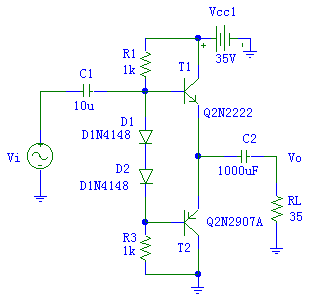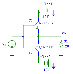 例1 乙類互補對稱功放電路如圖LT_01a所示,試運用PSPICE分析該電路。