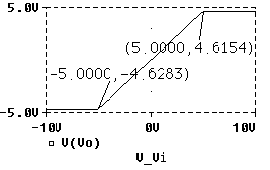 (3)設(shè)置直流掃描分析,電壓源Vi的掃描范圍為-10V~+10V。得電壓傳輸特性如圖g所示,由圖中看出,最大輸出電壓范圍約為-5V~+5V。