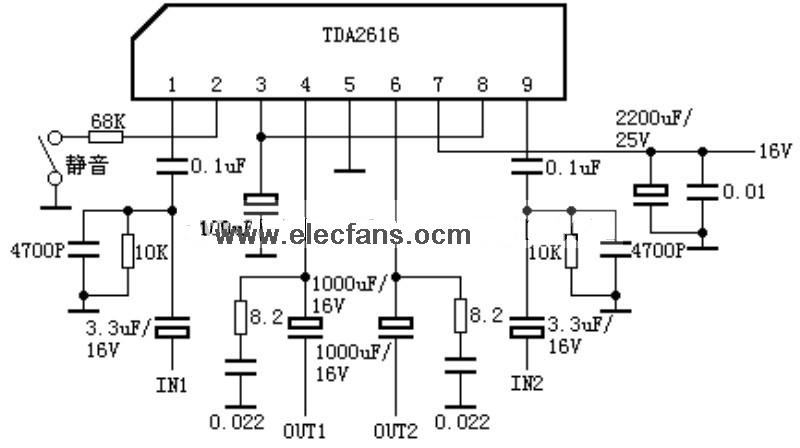 27TDA2616功放電路圖-應(yīng)用電路-單電源功放電路