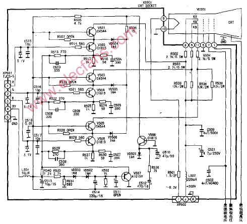 由于C514連接在電源+9V與V507基極之間,也可避免電源瞬變而引起亮度的瞬變。