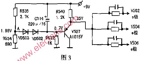 由V507, VD502,VD503, R534, R535, C514, R540組成的有源濾波器即為V502, V504, V506的射極靜態(tài)偏置電壓跟隨電路。R535,R534組成分壓網(wǎng)絡(luò),分壓點電壓1.85V經(jīng)VD503串VD502降壓至V507基極,約為0.7V,其射極電壓約為1.35V左右,作為共射放大器V502, V504, V506三只放大管的射極偏置電壓源。共基極放大器的基極偏置電壓直接由+9V電源提供,共基極放大管的基極經(jīng)C513交流接地,因此就輸入、輸出信號而言V501、V503,V505為共基電路。采用V507(PNP型管)作為視放共射放大器的射極靜態(tài)偏里電壓跟隨器,是因為視放共基極放大管V501, V503, V505的基極都接在+9V電源端點上。電源電壓稍有變化,就會影響其靜態(tài)工作點,使輸出管靜態(tài)集電極電位變動而影響熒屏的亮度。為此,采用圖3的電路,使共射放大器射極偏置電壓跟隨+9V電源微量的變動而同步變動,即+9V電源略有變化時,V502, V504,V506發(fā)射極電壓跟隨變化,確保共射、共基兩只晶體管不隨電源微量變動而變動,也就是說V501, V503, V505的集電極靜態(tài)電位不變。這一方面可保證大批量產(chǎn)品性能的一致性,也可確保單機亮度不受電源電壓微量變化的影響。VD503, VD502結(jié)電壓(0.5-0.7V)隨溫度上升而減小,使V507射極電位上升,可補償視放共射、共基級聯(lián)放大器兩只申聯(lián)晶體管隨溫度上升而增加,造成靜態(tài)工作點變化的影晌,使視放末級大器的溫漂減小、工作穩(wěn)定性大大提高。