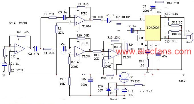 ? IC1為四運放集成電路TL084,差分放大器的頻響寬、噪聲低、瞬態(tài)指標(biāo)高。功率集成放大器除了采用TDA2009以外,亦可選用其它同類集成電路,不作特別要求。所用電阻全部采用低噪聲、精密型金屬膜電阻器,其目的是降低前置級噪聲,同時應(yīng)使得B、C兩點的信號幅度相等,所用的前置級耦合電容器也應(yīng)采用精密型鉭電容。三極管VT的功率應(yīng)視電路所需電流而定,并有足夠的容量儲備以期獲得良好的瞬態(tài)特性和足夠的動態(tài)范圍。