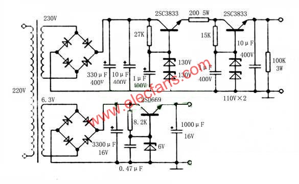 ??????每一聲道用—只50W的E型舊變壓器。高壓電源調(diào)整管最好開關(guān)管,只要耐壓大于400V、功率大于15W的就行了,這里筆者用的是拆機的開關(guān)管2SC3833。高壓延時電路板(圖3)我是從其它費棄的功放板中鋸下一塊做成的,繼電器用的是24V,延時時間,約為9秒,由R1和CT的乘積決定.如果把R1換成2M的電阻,延時時間約為9分鐘。由于不同的晶體管,管腳排列不—樣,加上高低壓電源也比較墑單,所以我沒有附上電源和延時電路的印板圖。圖4是整機各部分位置排列圖。圖5是印板和元器件排列圖。