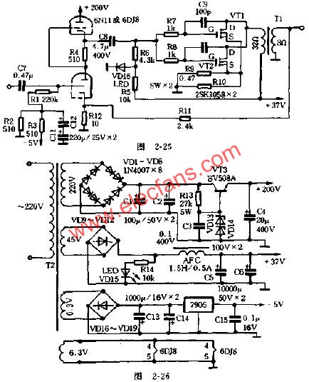 2、該放大器末級(jí)半導(dǎo)體功放管不用穩(wěn)壓電源供電,由圖2-26可知,