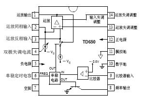 57 TD650 是高精度、高頻型單片集成電壓頻率(V/F)和頻率電壓(F/V)變換電路。TD650可構(gòu)成廉價高分辨率低速A/D 轉(zhuǎn)換器、遠(yuǎn)距離隔離信號傳輸電路、鎖相環(huán)電路、調(diào)制解調(diào)電路