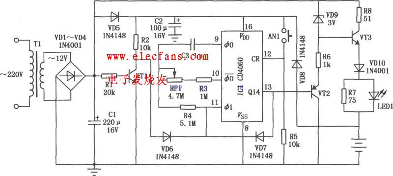 以上電路圖:CD4060構(gòu)成的具有定時功能的鎘鎳電池充電器