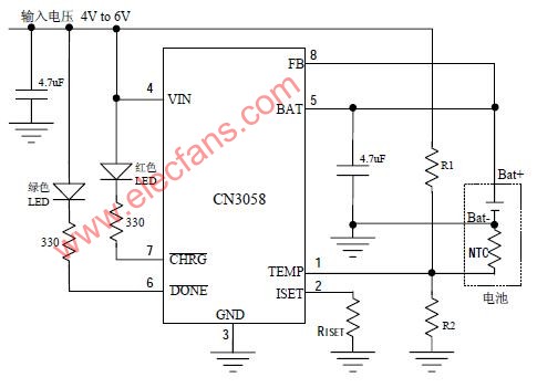 線性磷酸鐵鋰電池充電電路CN3058/CN3059/CN3060應(yīng)用電路圖