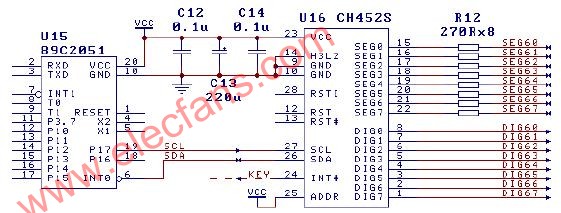 U2(28 腳封裝的CH452)的H3L2 引腳為低電平,CH452 通過(guò)2線(xiàn)串行接口與單片機(jī)U1相連接。