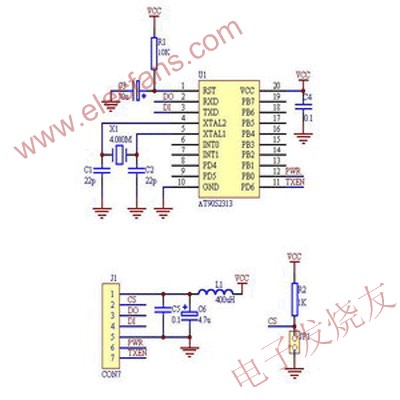 本文使用AT90S2313芯片做紅外遙控的電路,以下是電路圖有興趣的朋友可以做一個(gè)試一下!