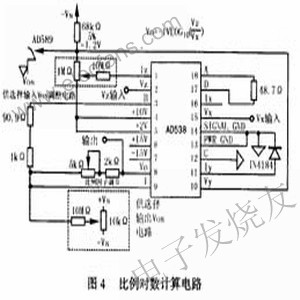 電路中5kΩ的電位器用于比例因子的調(diào)整,以得到每10倍程輸出1V的比例。輸出偏移電位器應(yīng)被設(shè)置成在Vx=Vz=1V時(shí)輸出為零。調(diào)整電路在VZ=1mV、VX=1V時(shí),輸出為3V。