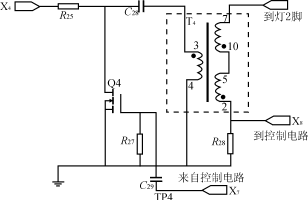 圖4是金鹵燈起動電路(也叫觸發(fā)脈沖產(chǎn)生電路)。金鹵燈需要用約6000V的窄脈沖來觸發(fā)起動。這個脈沖電壓是由升壓變壓器T4來產(chǎn)生的。由電阻R25、電容C28及MOSFETQ4構(gòu)成充放電電路,電容C28通過T4的引腳3及4到地,直流電壓從端子X4接入,經(jīng)過R25加到Q4的漏極上。在Q4的柵極未加驅(qū)動脈沖時,VCC通過R25對C28充電,充電電路是R25-C28-T4-地。當(dāng)來自控制電路的驅(qū)動脈沖(5個脈沖/秒)經(jīng)過接口X7加到Q4的柵極時,Q4導(dǎo)通,此時C28經(jīng)過Q4-T4放電,放電電流在T4中產(chǎn)生的電壓經(jīng)T4的次級升壓后,加到金鹵燈引線端2使金鹵燈點(diǎn)亮。