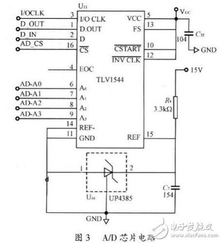 A/D 轉(zhuǎn)換芯片采用 TLV1544。TLVl544 的主要特點(diǎn)是:寬范圍的單電源供電,VCC可為 2.7~5.5V;芯片內(nèi)部有著較高的轉(zhuǎn)換速 率, 轉(zhuǎn)換時(shí)間小于 10μs;芯片提供4 路外部輸入通道,通過編程給芯片不同的狀態(tài)字設(shè)置可以任意選擇 4 個(gè)輸入通道之一;芯片有 4 個(gè)端口作為同步串行接口,通過 SPI 總線的形式與微處理器連接;11 位 A/D 轉(zhuǎn)換,足以滿足系統(tǒng)的要求。如圖 3 所示。