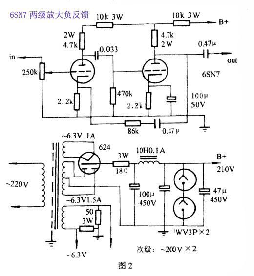 一款小型電子管功放的制作:這些電子管,棄之可惜.不妨將其利用起來(lái)自制成小功率電子管監(jiān)聽(tīng)功放。下面介紹的電子管功放就是用最常見(jiàn)的電子管制作的,其電路圖見(jiàn)圖2:前級(jí)用