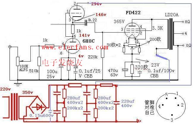 11 用五極功率放大管FD422制作單端甲類功放,本電路設(shè)計(jì)以“簡(jiǎn)潔至上”為原則,可以減少安裝失誤。按照先裝電源部分再裝輸出部分最后裝輸入部分的順序