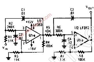 如圖所示為甚低頻有源濾波電路。這是一個巴特沃茲四階有源低通濾波器,適用于濾除直流電平信號上的甚低頻隨機脈沖噪聲干擾電壓,其截止頻率(-3dB)約為8Hz,在18Hz處,增益下降20dB。通帶內(nèi)固有