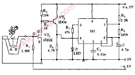 圖中所示是一個(gè)盆花缺水指示線路,主要由場(chǎng)效應(yīng)管BG1,晶體三極管BG2和555時(shí)基集成電路組成.