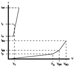 過電壓保護器件按工作原理可以分為鉗位型過電壓保護器件和折返式過電壓保護器件,常用的鉗位型過電壓保護器件有MOV(Metal oxide Varistors)和二極管,而折返式過電壓保護器件有GDT和可控硅過電壓保護器件。折返式過電壓保護器件的I/V曲線如圖1所示,它較鉗位型過電壓保護器件具有體積小和功耗低的優(yōu)點。SiBar就是一種基于N型半導(dǎo)體的折返式可控硅浪涌電壓過電壓保護器件(TSP)。