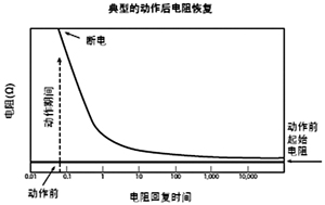 圖5表示PPTC元件過電流/過溫度后,當(dāng)過電流/過溫度故障消除后,PPTC元件阻值的恢復(fù)曲線??梢娂词谷舾尚r后,PPTC元件的阻值仍然大于初始阻值,電阻的減降將需持續(xù)一段較長的時間,最終電阻才會接近初始電阻,這個時間可能是幾天、幾個月或更久。但是,在實際應(yīng)用中,要使PPTC元件的阻值恢復(fù)到初始值是不現(xiàn)實的。所以在選用PPTC元件時,在決定PPTC的保持電流時就應(yīng)考慮PPTC元件動作后并恢復(fù)1小時后的初始電阻RImax這個參數(shù)。