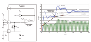 任何電源設(shè)計(jì)都要優(yōu)先考慮啟動(dòng),PFC轉(zhuǎn)換器也不例外。對(duì)大多數(shù)PFC應(yīng)用而言,穩(wěn)壓輸出電壓設(shè)置點(diǎn)在400V 范圍之內(nèi),故只要有任何電壓過(guò)沖,尤其是在軟啟動(dòng)期間,就會(huì)對(duì)輸出大電容和開(kāi)關(guān)組件造成額外的應(yīng)力。FAN9612能夠解決與啟動(dòng)有關(guān)的兩大重要問(wèn)題。第一是能夠在整個(gè)啟動(dòng)程序期間保持閉環(huán)軟啟動(dòng)。圖1所示為FAN9612專有軟啟動(dòng)電路的功能實(shí)現(xiàn)及啟動(dòng)程序仿真。