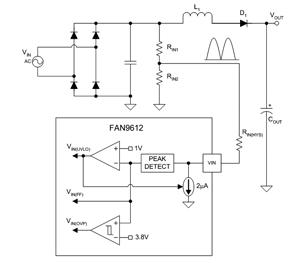 對(duì)于感測(cè)AC輸入電壓的PFC電路,大多數(shù)控制器都需要一個(gè)外部?jī)蓸O濾波器來(lái)獲得RMS線電壓。雖然這對(duì)線路UVLO(也稱為brown-out保護(hù),即電壓過(guò)低保護(hù))是可接受的,但兩極濾波器的慢速和低靈敏度會(huì)導(dǎo)致額外的線電流失真,從而妨礙利用 RMS 電壓信息來(lái)實(shí)現(xiàn)任何部分的PWM控制,比如電壓前饋。而FAN9612卻能夠通過(guò)感測(cè)AC輸入電壓的峰值來(lái)獲得RMS值。由于RMS值與線電壓峰值成比例,所需外部電路就從兩極濾波器簡(jiǎn)化為一個(gè)簡(jiǎn)單的電阻分壓器。如圖3所示,F(xiàn)AN9612利用經(jīng)過(guò)分壓(divided down)的峰值電壓信號(hào)來(lái)實(shí)現(xiàn)欠壓保護(hù)(VIN(UVLO))、輸入過(guò)壓保護(hù)(VIN(OVP)),以及電壓前饋(VIN(VFF))這些PWM控制任務(wù)。RIN1和RIN2的比值可用于設(shè)定VIN(OVP)、跳變點(diǎn)和欠壓保護(hù)級(jí)。FAN9612獨(dú)有的Brown out遲滯可編程特性,可通過(guò)內(nèi)部2μA電流源和RIN(HYS)進(jìn)行設(shè)置。