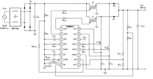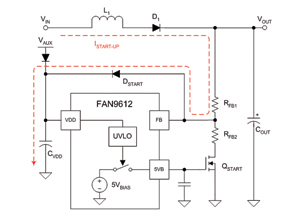 除了閉環(huán)軟啟動(dòng)工作模式之外,F(xiàn)AN9612還具有通過(guò)VOUT電阻分壓器網(wǎng)絡(luò)直接啟動(dòng)的可選功能。對(duì)于沒(méi)有足夠的輔助偏置電源電壓或待機(jī)電源的應(yīng)用,啟動(dòng)任何高電壓IC都必須對(duì)VDD電容進(jìn)行充電,直到電壓達(dá)到控制IC欠壓鎖定(UVLO)導(dǎo)通閾值為止。這一般需要額外的電路,因而會(huì)增加功耗及降低效率。有些設(shè)計(jì)人員會(huì)采用這種方法:當(dāng)通過(guò)自舉偏置(bootstrap bia)電源對(duì)PFC控制IC進(jìn)行供電時(shí),關(guān)斷啟動(dòng)電路。雖然這種方案有助于降低功耗,但往往需要高側(cè)開(kāi)關(guān)和驅(qū)動(dòng)電路,從而增加外部組件的數(shù)目。FAN9612經(jīng)特別設(shè)計(jì),無(wú)須外部啟動(dòng)電阻即可啟動(dòng)。在FB和VDD之間增加一個(gè)小信號(hào)二極管DSTART即可提供一條經(jīng)過(guò)RFB1的電流路徑,見(jiàn)圖2中的紅色虛線。一旦內(nèi)部5V參考電壓有輸出,小信號(hào)MOSFET QSTART就被開(kāi)通,電阻反饋網(wǎng)絡(luò)即從啟動(dòng)功能中解脫出來(lái)。另外也可以根據(jù)情況,忽略DSTART和QSTART,采用傳統(tǒng)的啟動(dòng)方法。