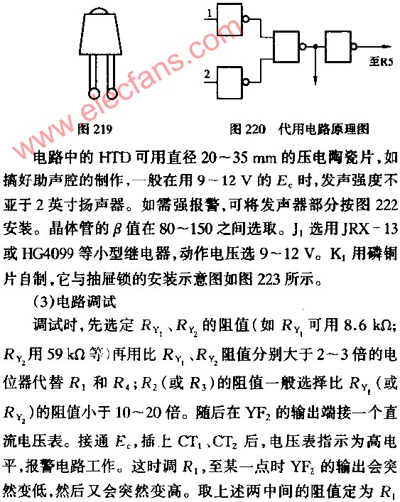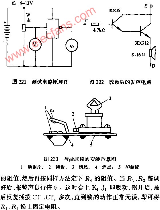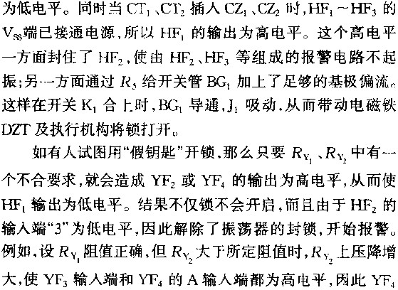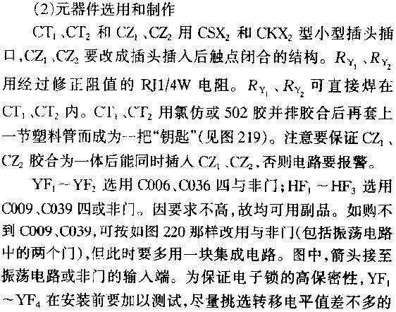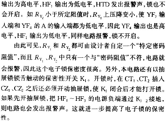 此報(bào)警電子鎖僅由兩塊CMOS門電路和一些分立元件組成,具有線路新穎簡(jiǎn)單、選材容易、保密性很強(qiáng)的特點(diǎn)。“鑰匙”的阻值可在1千歐之間選取,如果用阻值不符的“假鑰匙”去開(kāi)鎖,電路就會(huì)發(fā)出響亮的報(bào)警聲。