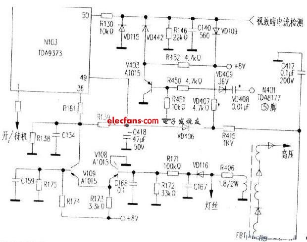 523 開機后無光柵,顯像管燈絲亮。根據(jù)現(xiàn)象分析,該故障一般發(fā)生在顯像管供電電路。開機觀察,關(guān)機