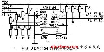 為ADM1184監(jiān)視4個(gè)電源通道的一個(gè)應(yīng)用。在該應(yīng)用中,ADM1184依次開(kāi)啟3個(gè)穩(wěn)壓器,當(dāng)所有的電源供電穩(wěn)定后產(chǎn)生供電正常信號(hào)來(lái)開(kāi)啟控制器。