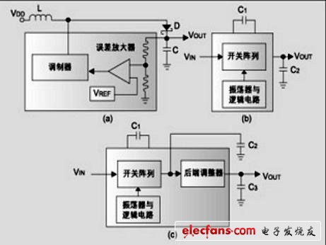 3 種電荷泵的工作過程均為:首先貯存能量,然后以受控方式釋放能量,以獲得所需的輸出電壓。開關(guān)式調(diào)整器升壓泵采用電感器來貯存能量,而電容式電荷泵采用電容器來貯存能量。