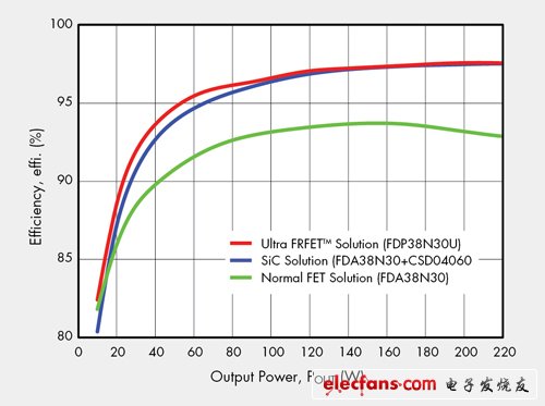 圖3則顯示採用Ultra FRFET時,相較于標(biāo)準(zhǔn)的UniFET II MOSFET,約可減少75%的導(dǎo)通損耗;同時也減少導(dǎo)通延遲時間、電流和電壓振鈴,并消除串聯(lián)蕭特基二極體的傳導(dǎo)損耗。不僅如此,UniFET II還降低COSS,優(yōu)化開關(guān)效率。圖4所示為Ultra FRFET MOSFET、標(biāo)準(zhǔn)MOSFET和SiC結(jié)構(gòu)的效率比較。