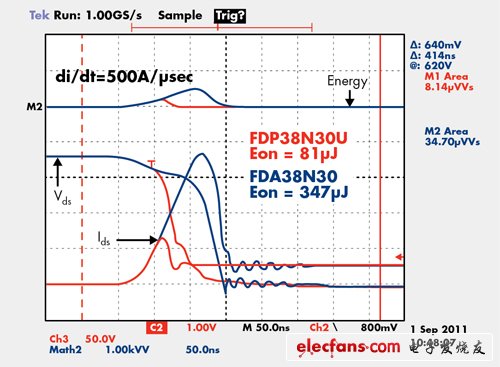 圖2顯示Ultra FRFET UniFET II MOSFET和常規(guī)UniFET MOSFET元件之間的二極體恢復(fù)比較。在這種情況下,QRR已經(jīng)從3,100nC減少到260nC,且二極體開關(guān)損耗也顯著降低。
