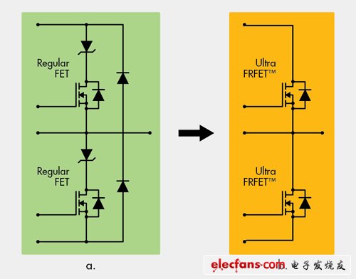 圖1 以Ultra FRFET MOSFET(b)取代逆變器橋臂中失效的常規(guī)FET自體二極體(a)