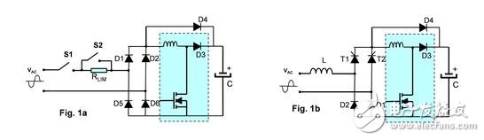 圖1: 基于電阻器和繼電器的電涌限流電路 (a)和基于混合整流橋的電涌限流電路(b)