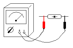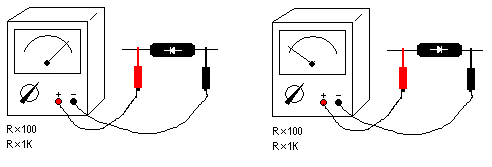 4. 用萬用表 R*100 或 R*1K 檔,任意測量二極管的兩根引線,如果量出的電阻只有幾百歐姆(正向電阻),則黑表筆(既萬用表內(nèi)電池正極)所接引線為正極,紅表筆(既萬用表內(nèi)電源負極)所接引線為負極。(見圖 5 )