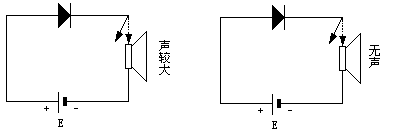 2. 如沒有萬用表,也可用電池、喇叭(或耳機)與被測二極管串接。當二極管負端接電池正極,正端串接喇叭再接電池負極(反向連接),斷續(xù)接通時,若喇叭發(fā)出教大的“咯咯”聲,表明二極管已擊傳(如圖 9a 所示);反過來,如果將二極管正向連續(xù)接通時(如圖 9b 所示),喇叭無一點響聲,表明二極管內(nèi)部斷路。