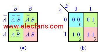 ,第二列表示B。這樣四個小方格就由四個最小項分別對號占有,行和列的符號相交就以最小項的與邏輯形式記入該方格中。
