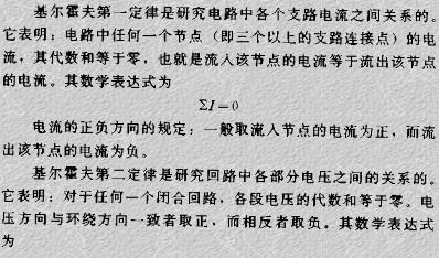 基爾霍夫電流定律:在電路任一節(jié)點,流入、流出該節(jié)點電流的代數(shù)和為零。基爾霍夫電壓定律:在電路中的任一閉合電路,電壓的代數(shù)和為零。