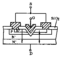 眾所周知,傳統(tǒng)的MOS場(chǎng)效應(yīng)管的柵極、源極和漏極大大致處于同一水平面的芯片上,其工作電流基本上是沿水平方向流動(dòng)。VMOS管則不同,從左下圖上可以看出其兩大結(jié)構(gòu)特點(diǎn):第一,金屬柵極采用V型槽結(jié)構(gòu);第二,具有垂直導(dǎo)電性。由于漏極是從芯片的背面引出,所以ID不是沿芯片水平流動(dòng),而是自重?fù)诫sN+區(qū)(源極S)出發(fā),經(jīng)過(guò)P溝道流入輕摻雜N-漂移區(qū),最后垂直向下到達(dá)漏極D。電流方向如圖中箭頭所示,因?yàn)榱魍ń孛娣e增大,所以能通過(guò)大電流。由于在柵極與芯片之間有二氧化硅絕緣層,因此它仍屬于絕緣柵型MOS場(chǎng)效應(yīng)管。