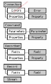ADO對象模型包含九個對象和四個集合,如圖所示,灰色背景的是對象,白色背景的是集合