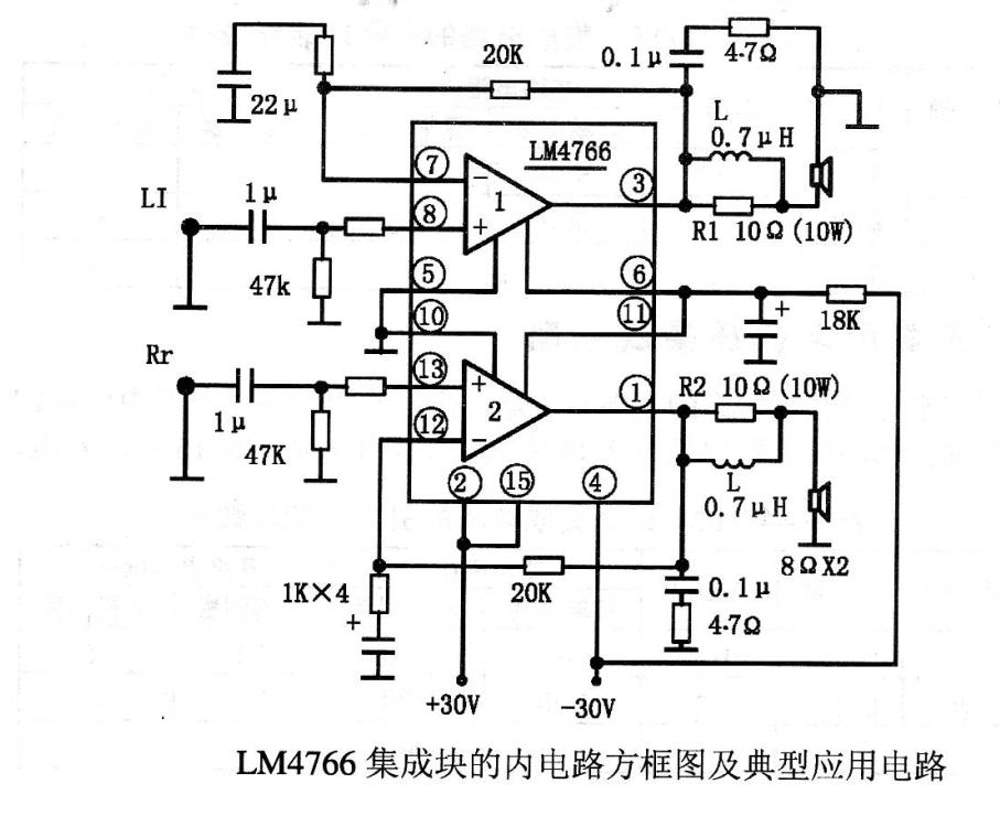 圖1是2×30W雙聲道音頻功率放大器,其核心器件ICl采用高保真音響功放集成電路STK465,該電路內包含兩個性能指標完